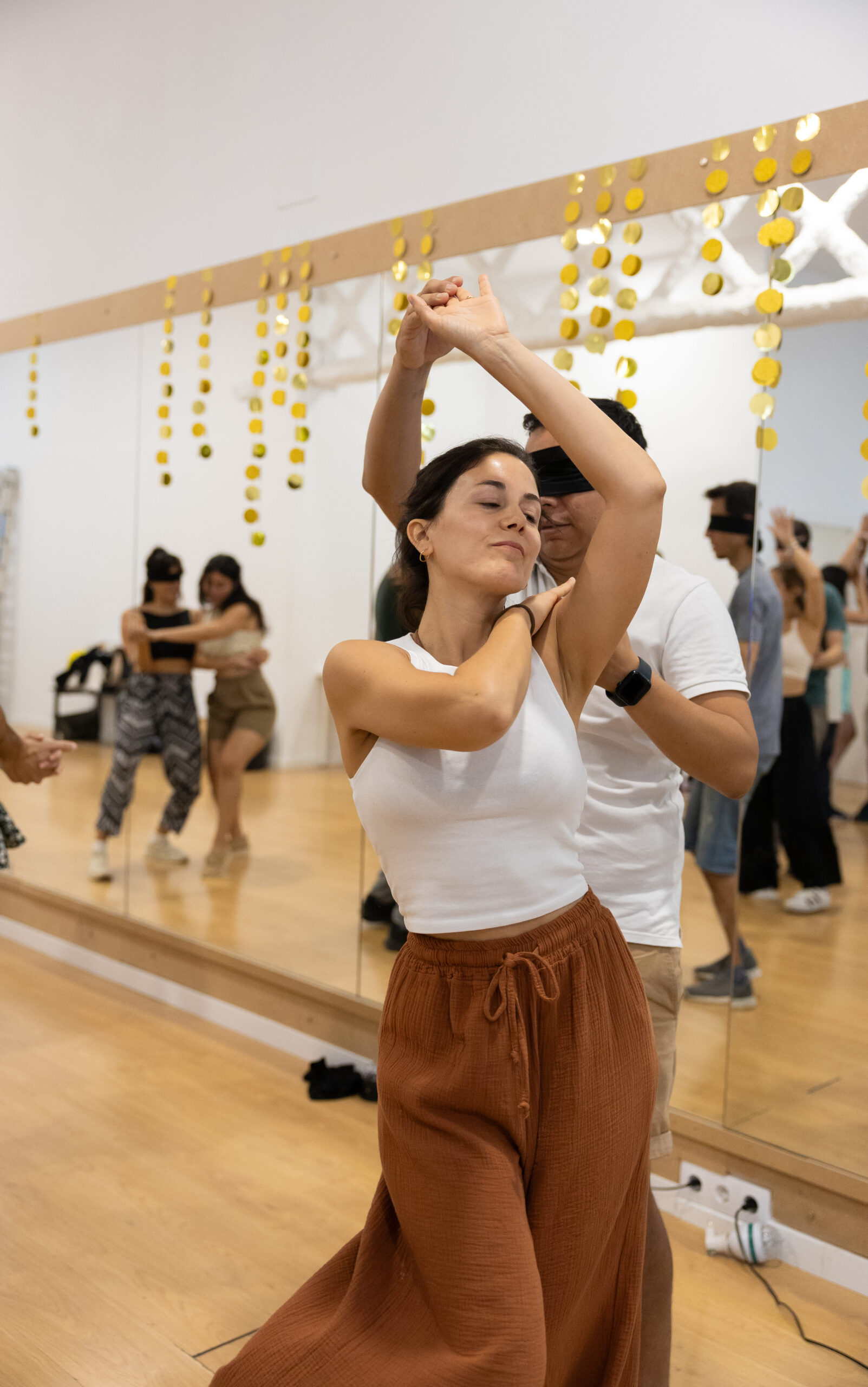 En nuestros sociales le damos una gran foco a la parte de la conexión, por eso siempre encontrarás que hay una parte de bailar con vendas. Esto te lo puedes encontrar durante el taller o a medio social como dinámica de conexión.